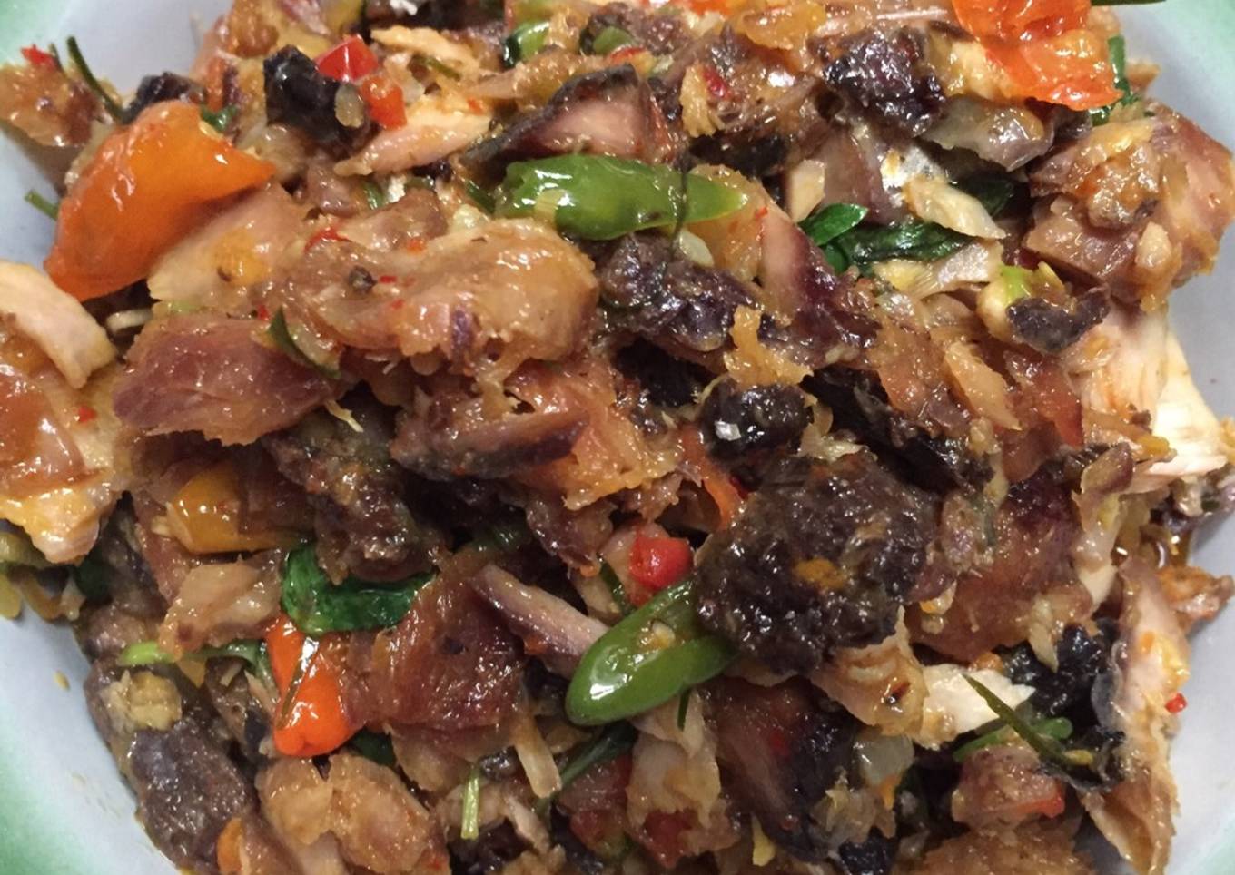 - Tambahkan sedikit air. Masak hingga air agak menyusut. Koreksi rasa. Terakhir masukkan daun kemangi. Aduk hingga benar-benar rata.