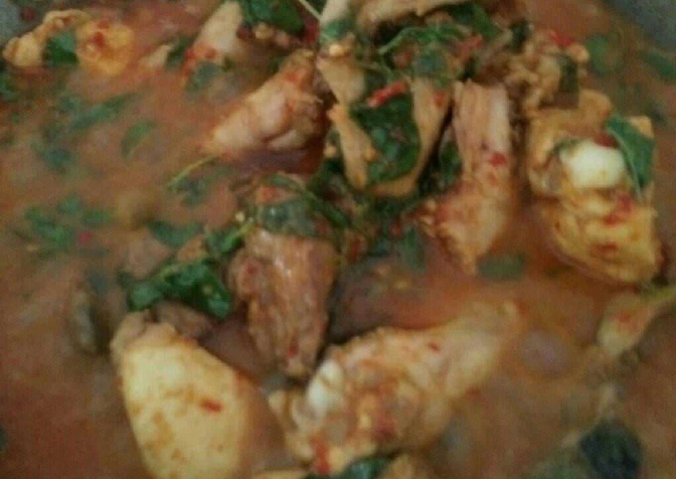 - Setelah menyusut dan ayam matang,beri daun bawang,dan daun kemangi,uumm akan tercium aroma harum dari kemangi,matikan kompor,dan siap di hidangka bersama nasi hangat..