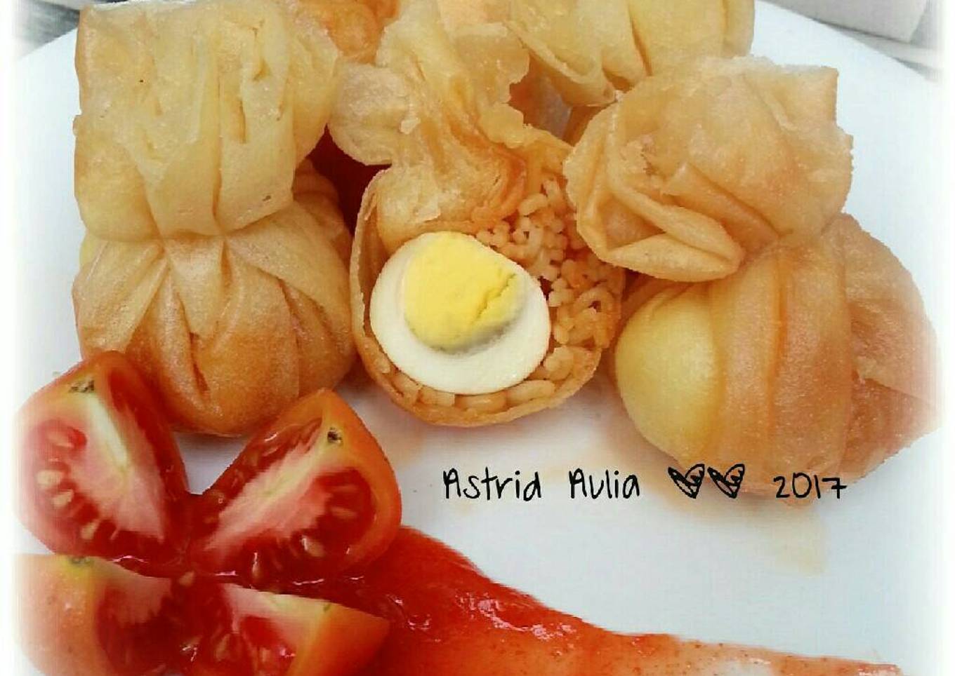 - Isi kulit lumpia dgn mie dan telur, ikat ke atas seperti pocong 😆