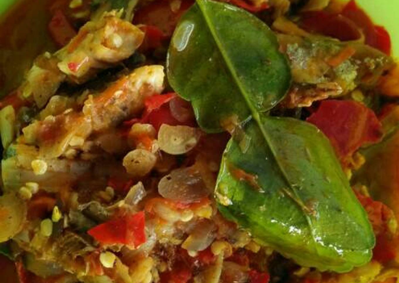 - Tumis 10 bawang merah (iris kasar) dan daun jeruk. Masukkan bumbu halus (10 siung bawang merah,10 cabe kriting,5 siung bawang putih)