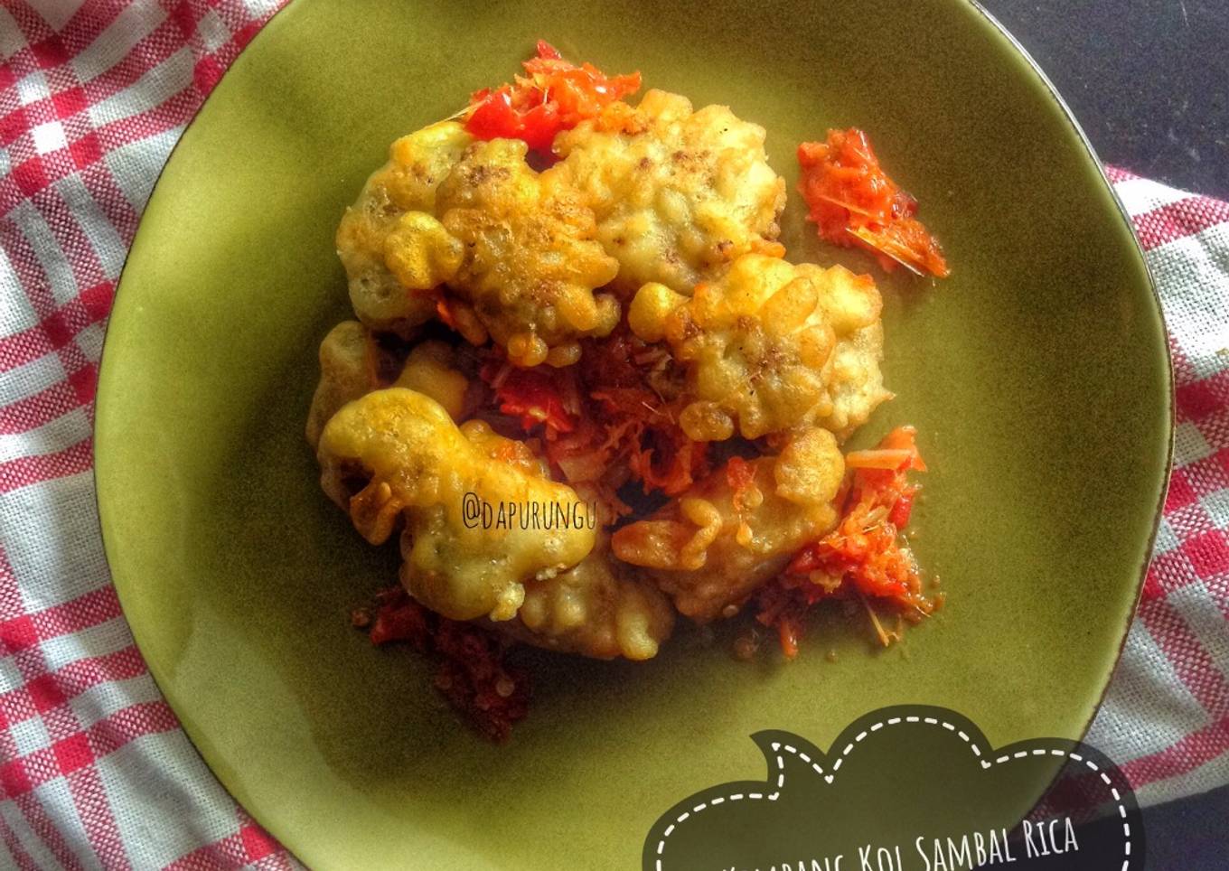 - Celup kembang kol di tepung bumbu (tepung recikan sendiri) lalu goreng hingga kuning keemasan. tiriskan. sisihkan