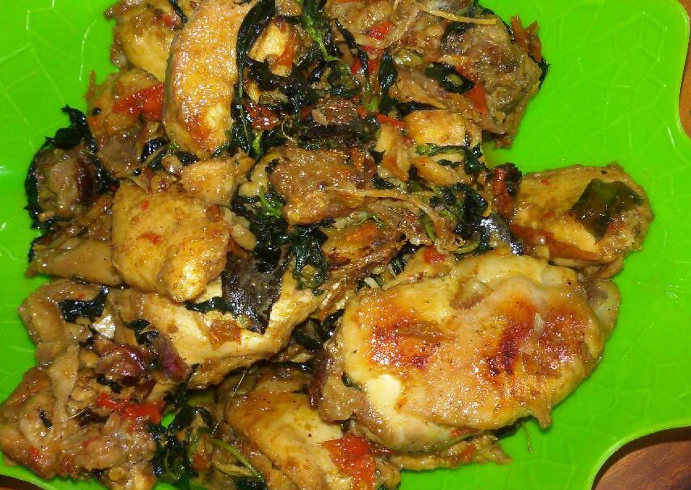 - Setelah air surut masukan kemangi atau sampai mengering seperti digoreng, angkat ayam lalu sajikan.