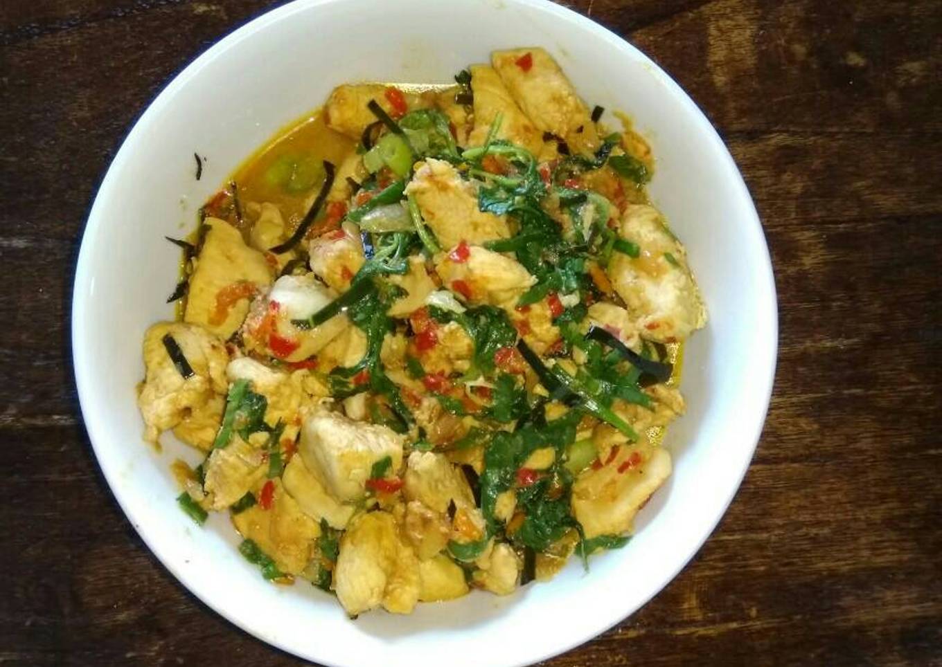- Matikan kompor, masukkan daun bawang, aduk sampai tercampur rata