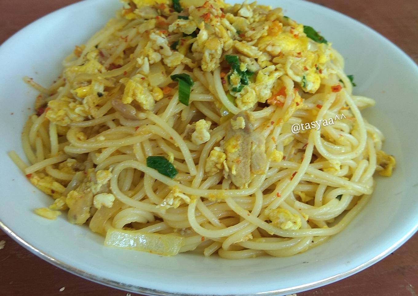 - Masukkan spagetti... Beri saos sambal + kecap.. Aduk rata.. Masak hingga matang.. Sajikan.. Lalu taburi dengan cabai bubuk..