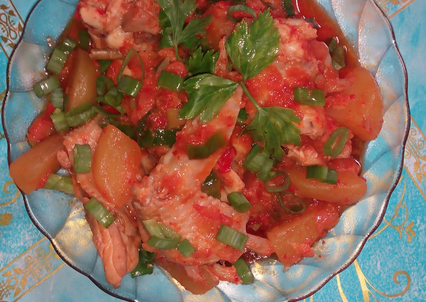 - Rebus ayam yang sudah dilumuri jeruk nipis dan kentang, masukkan bawang putih keprek. Rebus sampai ayam dan kentang empuk.