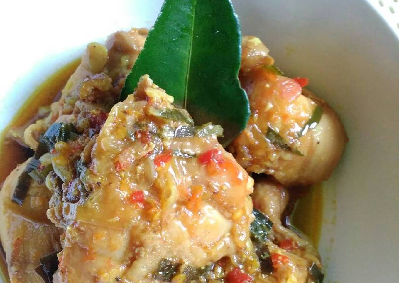 - Tumis bawang bombay hingga layu, masukkan bumbu halus, serai, daun jeruk dan daun pandan. Tumis hingga harum. Tambahkan air secukupnya (sampai ayam terendam, supaya ayam benar-benar matang), gula, dan garam. Tes rasa.